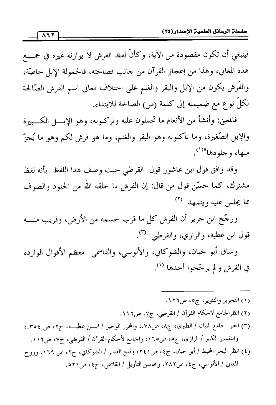 وقد وافق قول ابن عاشور قول القرطبي حيث وصف هذا اللفظ بأنه لفظ مشترك، كما حسّن قول من قال أن الفرش ما خلقه الله من الجلود والصوف مما يجلس عليه ويتمهد (¬2)
