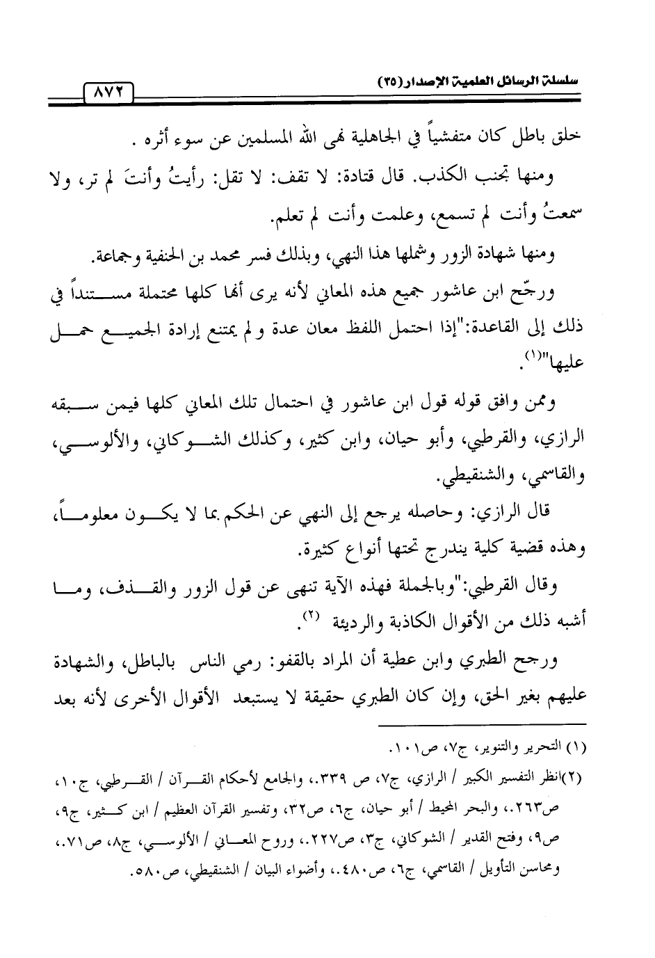 وقال القرطبي: " وبالجملة فهذه الآية تنهى عن قول الزور والقذف، وما أشبه ذلك من الأقوال الكاذبة والرديئة (¬2).