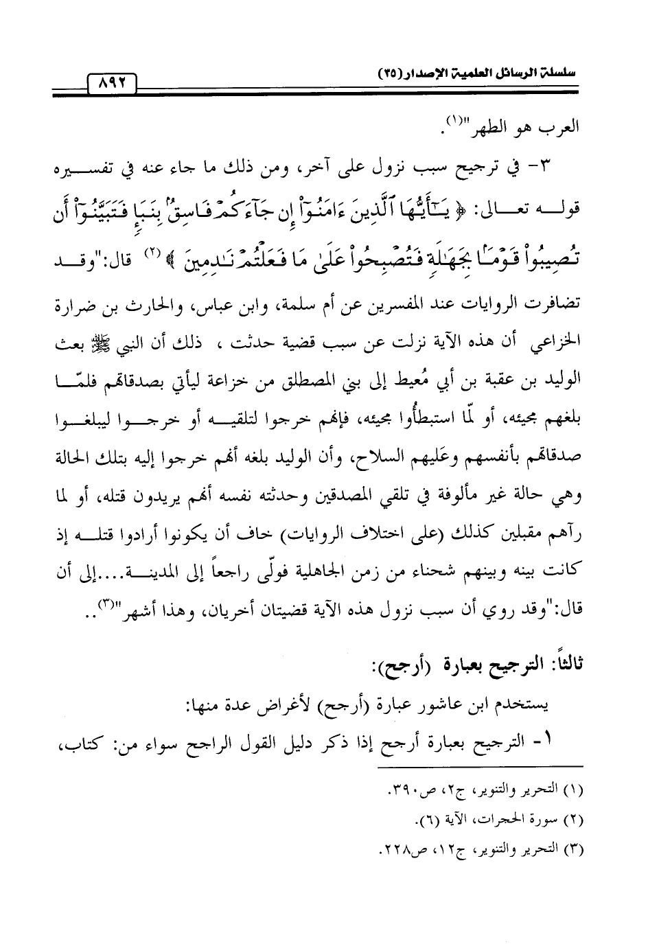 كتاب قواعد الترجيح المتعلقة بالنص عند ابن عاشور في تفسيره التحرير والتنوير