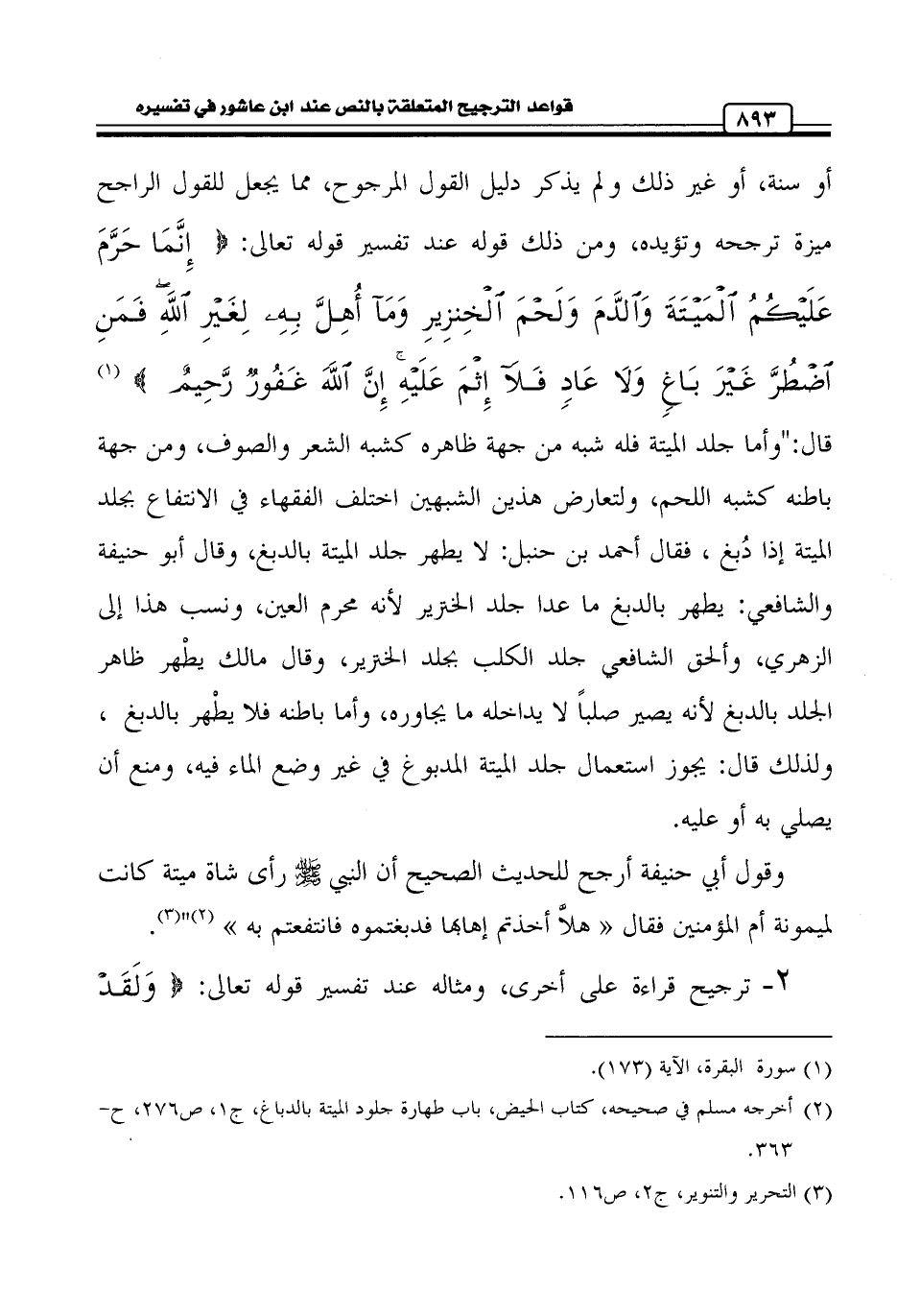 كتاب قواعد الترجيح المتعلقة بالنص عند ابن عاشور في تفسيره التحرير والتنوير