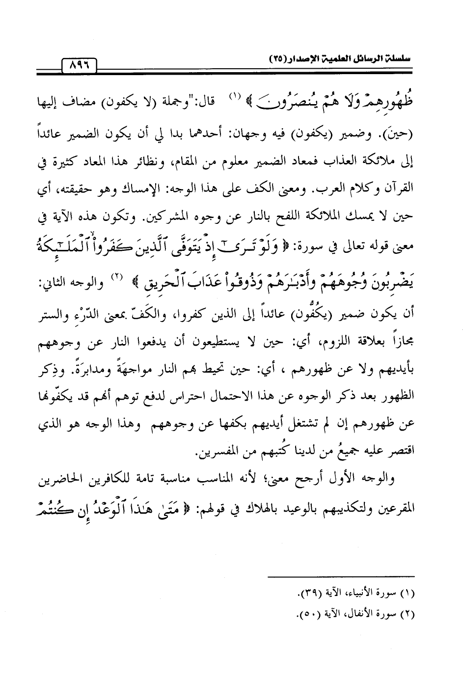 ظُهُورِهِمْ وَلَا هُمْ يُنْصَرُونَ} (¬1) قال: " وجملة (لا يكفون) مضاف إليها (حينَ). وضمير (يكفون) فيه وجهان: أحدهما بدا لي أن يكون الضمير عائداً إلى ملائكة العذاب فمعاد الضمير معلوم من المقام، ونظائر هذا المعاد كثيرة في القرآن وكلام العرب. ومعنى الكف على هذا الوجه: الإمساك وهو حقيقته، أي حين لا يمسك الملائكة اللفح بالنار عن وجوه المشركين. وتكون هذه الآية في معنى قوله تعالى في سورة: {وَلَوْ تَرَى إِذْ يَتَوَفَّى الَّذِينَ كَفَرُوا الْمَلَائِكَةُ يَضْرِبُونَ وُجُوهَهُمْ وَأَدْبَارَهُمْ وَذُوقُوا عَذَابَ الْحَرِيقِ} (¬2) والوجه الثاني: أن يكون ضمير (يكُفُّون) عائداً إلى الذين كفروا، والكَفّ بمعنى الدّرْءِ والستر مجازاً بعلاقة اللزوم، أي: حين لا يستطيعون أن يدفعوا النار عن وجوههم بأيديهم ولا عن ظهورهم , أي: حين تحيط بهم النار مواجهَةً ومدابرَةً. وذِكر الظهور بعد ذكر الوجوه عن هذا الاحتمال احتراس لدفع توهم أنهم قد يكفّونها عن ظهورهم إن لم تشتغل أيديهم بكفها عن وجوههم وهذا الوجه هو الذي اقتصر عليه جميعُ من لدينا كُتبهم من المفسرين.