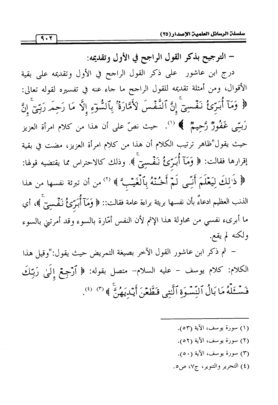 درج ابن عاشور على ذكر القول الراجح في الأول وتقديمه على بقية الأقوال، ومن أمثلة تقديمه للقول الراجح ما جاء عنه في تفسيره لقوله تعالى: {وَمَا أُبَرِّئُ نَفْسِي إِنَّ النَّفْسَ لَأَمَّارَةٌ بِالسُّوءِ إِلَّا مَا رَحِمَ رَبِّي إِنَّ رَبِّي غَفُورٌ رَحِيمٌ} (¬1). حيث نصّ على أن هذا من كلام امرأة العزيز حيث يقول " ظاهر ترتيب الكلام أن هذا من كلام امرأة العزيز، مضت في بقية إقرارها فقالت: {وَمَا أُبَرِّئُ نَفْسِي}. وذلك كالاحتراس مما يقتضيه قولها: {ذَلِكَ لِيَعْلَمَ أَنِّي لَمْ أَخُنْهُ بِالْغَيْبِ} (¬2) من أن تبرئة نفسها من هذا الذنب العظيم ادعاءٌ بأن نفسها بريئة براءة عامة فقالت: : {وَمَا أُبَرِّئُ نَفْسِي}، أي ما أبرئ نفسي من محاولة هذا الإثم لأن النفس أمّارة بالسوء وقد أمرتني بالسوء ولكنه لم يقع.