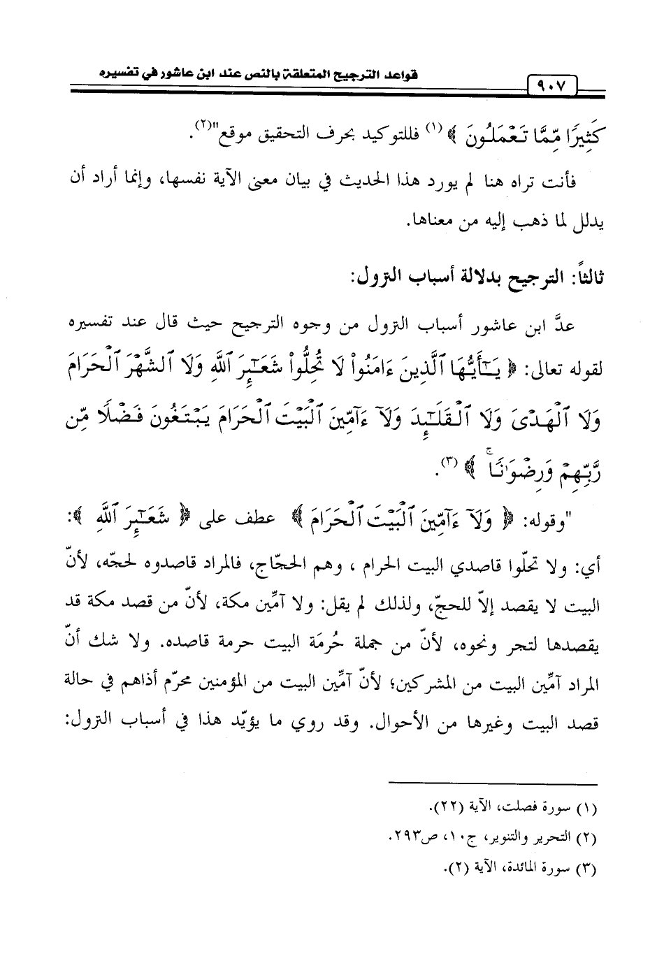 عدَّ ابن عاشور أسباب النزول من وجوه الترجيح حيث قال عند تفسيره لقوله تعالى: {يَاأَيُّهَا الَّذِينَ آمَنُوا لَا تُحِلُّوا شَعَائِرَ اللَّهِ وَلَا الشَّهْرَ الْحَرَامَ وَلَا الْهَدْيَ وَلَا الْقَلَائِدَ وَلَا آمِّينَ الْبَيْتَ الْحَرَامَ يَبْتَغُونَ فَضْلًا مِنْ رَبِّهِمْ وَرِضْوَانًا} (¬3).