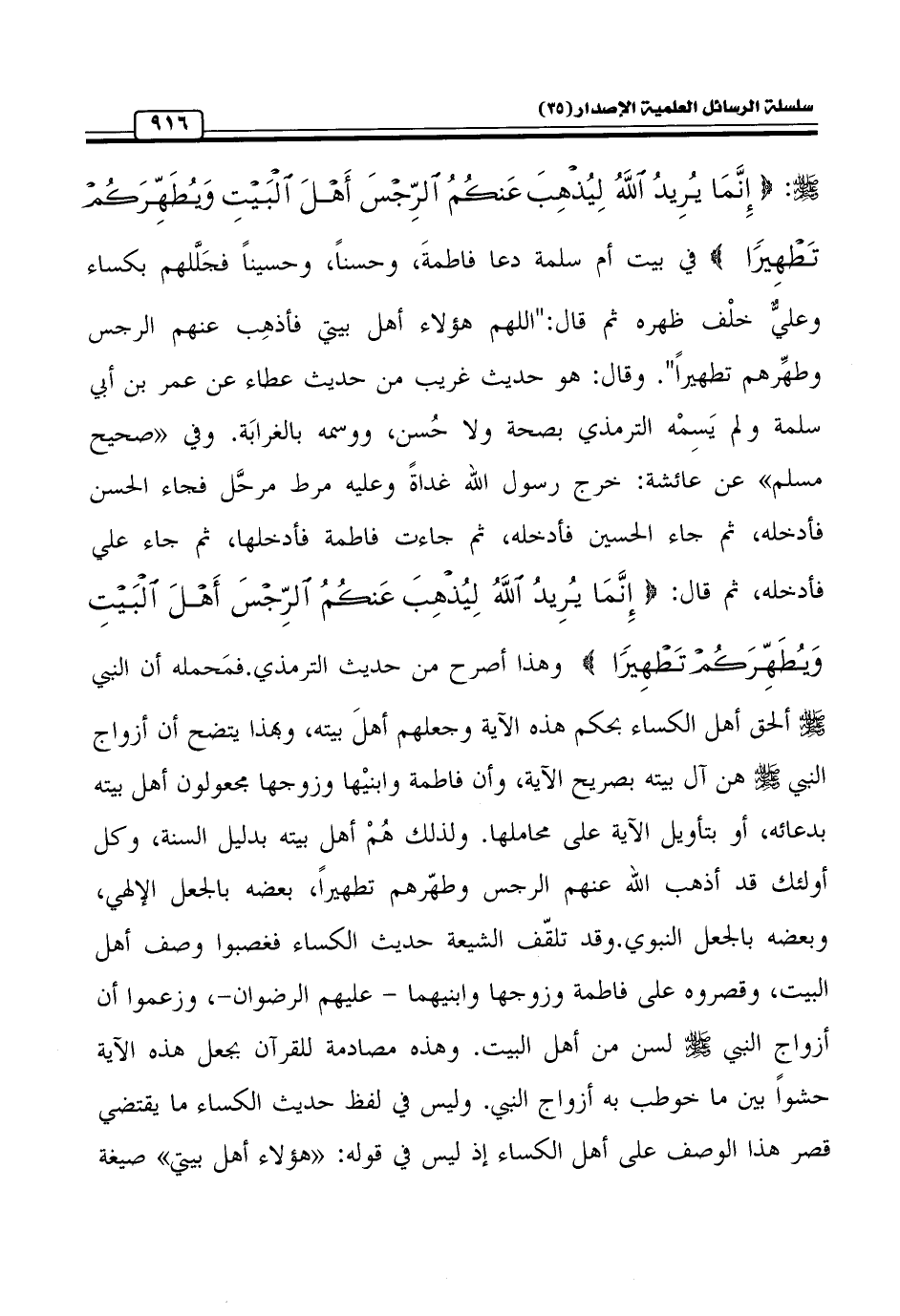 - صلى الله عليه وسلم -: {إِنَّمَا يُرِيدُ اللَّهُ لِيُذْهِبَ عَنْكُمُ الرِّجْسَ أَهْلَ الْبَيْتِ وَيُطَهِّرَكُمْ تَطْهِيرًا} في بيت أم سلمة دعا فاطمةَ وحسناً وحسيناً فجَلَّلهم بكساء وعليٌّ خلْف ظهره ثم قال: " اللهم هؤلاء أهل بيتي فأذهِب عنهم الرجس وطهِّرهم تطهيراً ". وقال: هو حديث غريب من حديث عطاء عن عمر بن أبي سلمة ولم يَسِمْه الترمذي بصحة ولا حُسن، ووسمه بالغرابَة. وفي «صحيح مسلم» عن عائشة: خرج رسول الله غداةً وعليه مرط مرحَّل فجاء الحسن فأدخله، ثم جاء الحسين فأدخله، ثم جاءت فاطمة فأدخلها، ثم جاء علي فأدخله، ثم قال: {إِنَّمَا يُرِيدُ اللَّهُ لِيُذْهِبَ عَنْكُمُ الرِّجْسَ أَهْلَ الْبَيْتِ وَيُطَهِّرَكُمْ تَطْهِيرًا} وهذا أصرح من حديث الترمذي. فمَحمله أن النبي - صلى الله عليه وسلم - ألحق أهل الكساء بحكم هذه الآية وجعلهم أهلَ بيته، وبهذا يتضح أن أزواج النبي - صلى الله عليه وسلم - هن آل بيته بصريح الآية، وأن فاطمة وابنيْها وزوجها مجعولون أهل بيته بدعائه أو بتأويل الآية على محاملها. ولذلك هُمْ أهل بيته بدليل السنة، وكل أولئك قد أذهب الله عنهم الرجس وطهّرهم تطهيراً، بعضه بالجعل الإلهي، وبعضه بالجعل النبوي. وقد تلقّف الشيعة حديث الكساء فغصبوا وصف أهل البيت، وقصروه على فاطمة وزوجها وابنيهما عليهم الرضوان، وزعموا أن أزواج النبي - صلى الله عليه وسلم - لسن من أهل البيت.