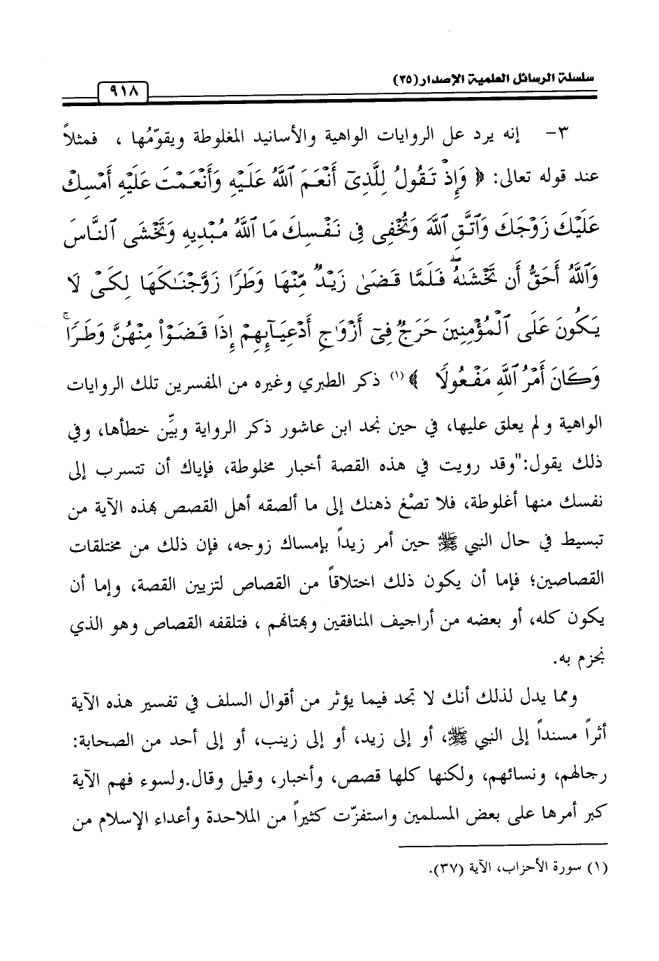 ومما يدل لذلك أنك لا تجد فيما يؤثر من أقوال السلف في تفسير هذه الآية أثراً مسنداً إلى النبي - صلى الله عليه وسلم - أو إلى زيد أو إلى زينب أو إلى أحد من الصحابة رجالهم ونسائهم، ولكنها كلها قصص وأخبار وقيل وقال. ولسوء فهم الآية كبر أمرها على بعض المسلمين واستفزّت كثيراً من الملاحدة وأعداء الإسلام من