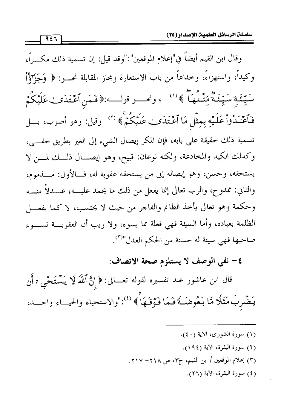 وقال ابن القيم أيضاً في " أعلام الموقعين ": " وقد قيل إن تسمية ذلك مكراً وكيداً واستهزاءً وخداعاً من باب الاستعارة ومجاز المقابلة نحو: {وَجَزَاءُ سَيِّئَةٍ سَيِّئَةٌ مِثْلُهَا} (¬1) , ونحو قوله: {فَمَنِ اعْتَدَى عَلَيْكُمْ فَاعْتَدُوا عَلَيْهِ بِمِثْلِ مَا اعْتَدَى عَلَيْكُمْ} (¬2) وقيل: وهو أصوب، بل تسمية ذلك حقيقة على بابه، فإن المكر إيصال الشيء إلى الغير بطريق خفي، وكذلك الكيد والمخادعة، ولكنه نوعان قبيح، وهو إيصال ذلك لمن لا يستحقه، وحسن، وهو إيصاله إلى من يستحقه عقوبة له، فالأول مذموم، والثاني ممدوح، والرب تعالى إنما يفعل من ذلك ما يحمد عليه، عدلاً منه وحكمة وهو تعالى يأخذ الظالم والفاجر من حيث لا يحتسب، لا كما يفعل الظلمة بعباده، وأما السيئة فهي فعلة مما يسوء، ولا ريب أن العقوبة تسوء صاحبها فهي سيئة له حسنة من الحكم العدل " (¬3).