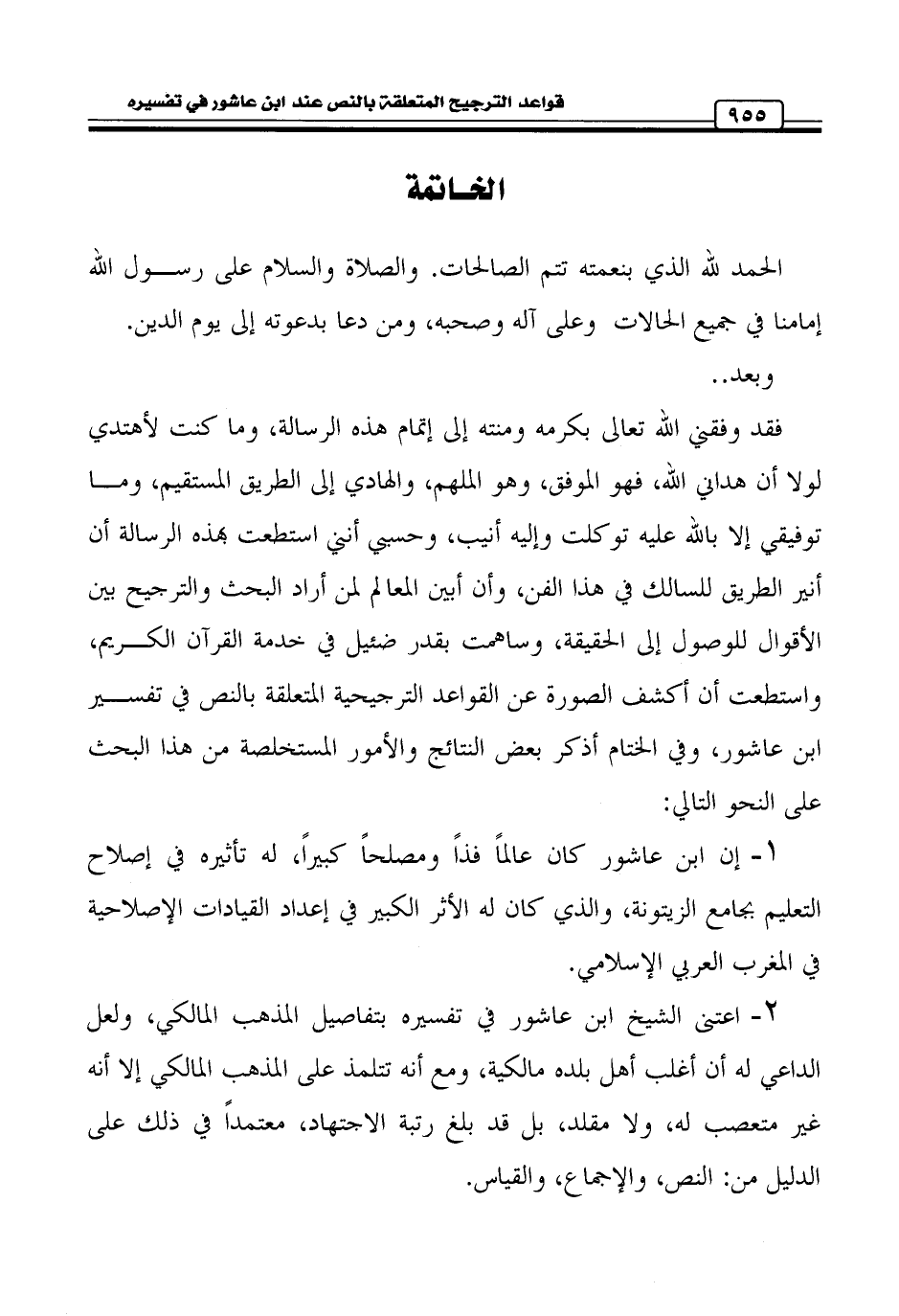فقد وفقني الله تعالى بكرمه ومنته إلى إتمام هذه الرسالة، وما كنت لأهتدي لولا أن هداني الله، فهو الموفق، وهو الملهم، والهادي إلى الطريق المستقيم، وما توفيقي إلا بالله عليه توكلت وإليه أنيب، وحسبي أنني استطعت بهذه الرسالة أن أنير الطريق للسالك في هذا الفن، وأن أبين المعالم لمن أراد البحث والترجيح بين الأقوال للوصول إلى الحقيقة، وساهمت بقدر ضئيل في خدمة القرآن الكريم، واستطعت أن أكشف الصورة عن القواعد الترجيحية المتعلقة بالنص في تفسير ابن عاشور، وفي الختام أذكر بعض النتائج والأمور المستخلصة من هذا البحث على النحو التالي: