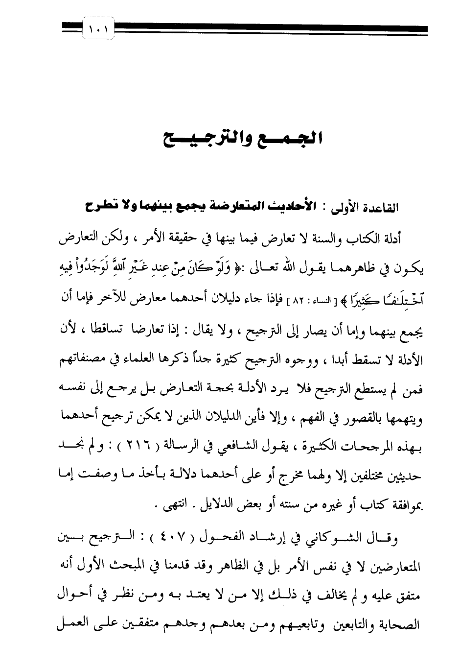وقال الشوكاني في إرشاد الفحول "407": الترجيح بين المتعارضين لا في نفس الأمر بل في الظاهر وقد قدمنا في المبحث الأول أنه متفق عليه ولم يخالف في ذلك إلا من لا يعتد به ومن نظر في أحوال الصحابة والتابعين وتابعيهم ومن بعدهم وجدهم متفقين على العمل بالراجح وترك المرجوح. انتهى.