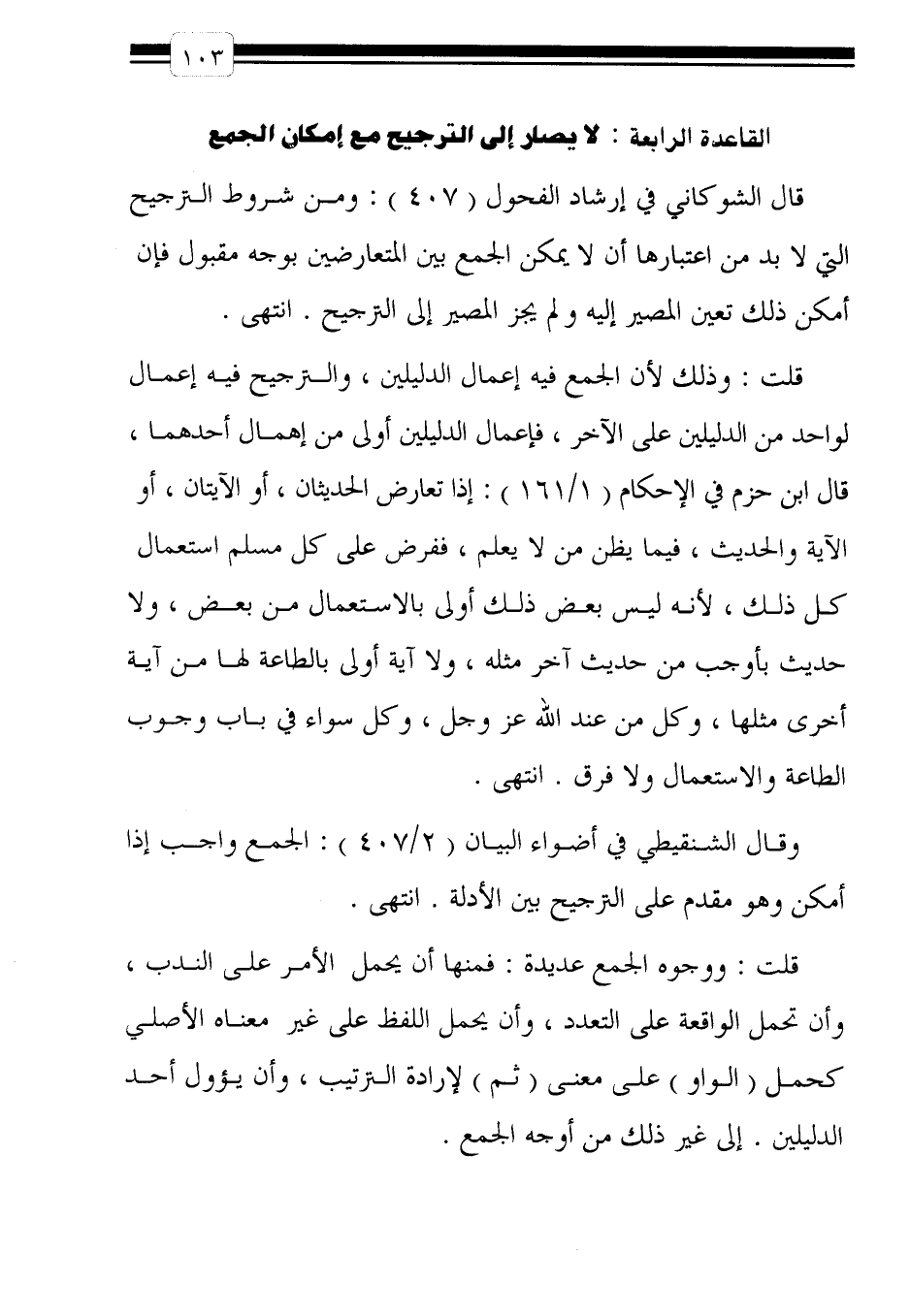 القاعدة الرابعة: لا يصار إلى الترجيح مع إمكان الجمع
