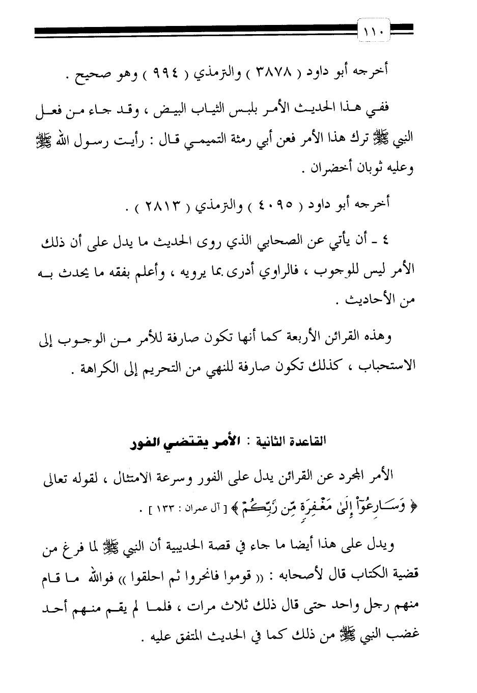 الأمر المجرد عن القرائن يدل على الفور وسرعة الامتثال، لقوله تعالى: {وَسَارِعُوا إِلَى مَغْفِرَةٍ مِنْ رَبِّكُمْ} [آل عمران: 133] .