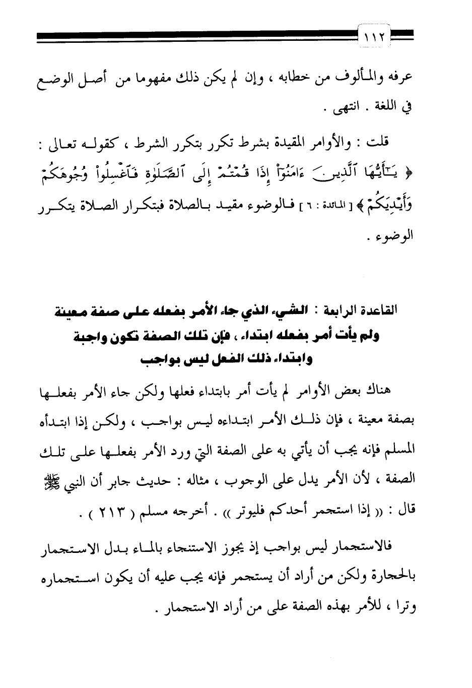 القاعدة الرابعة: الشيء الذي جاء الأمر بفعله على صفة معينة ولم يأت أمر بفعله ابتداء، فإن تلك الصفة تكون واجبة وابتداء ذلك الفعل ليس بواجب