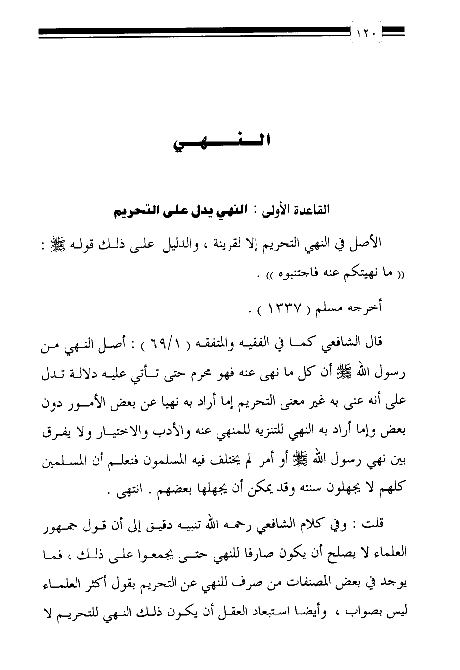 قال الشافعي كما في الفقيه والمتفقه "1/69": أصل النهي من رسول الله صلى الله عليه وسلم أن كل ما نهى عنه فهو محرم حتى تأتي عليه دلالة تدل على أنه عنى به غير معنى التحريم إما أراد به نهيا عن بعض الأمور دون بعض وإما أراد به النهي للتنزيه للمنهي عنه والأدب والاختيار ولا يفرق بين نهي رسول الله صلى الله عليه وسلم أو أمر لم يختلف فيه المسلمون فنعلم أن المسلمين كلهم لا يجهلون سنته وقد يمكن أن يجهلها بعضهم. انتهى.
