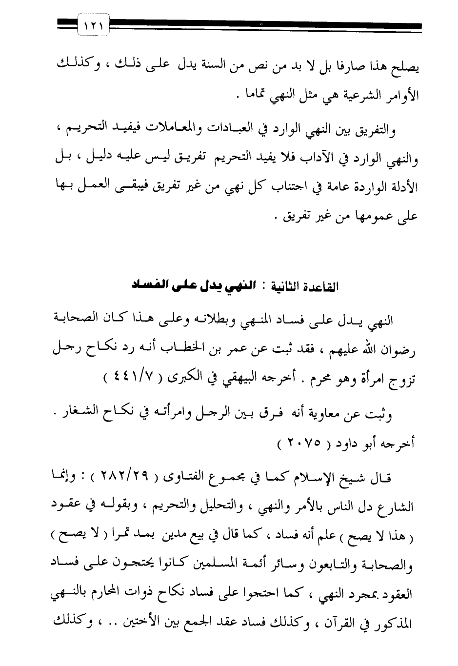 قال شيخ الإسلام كما في مجموع الفتاوى "29/282": وإنما الشارع دل الناس بالأمر والنهي، والتحليل والتحريم، وبقوله في عقود "هذا لا يصح" علم أنه فساد، كما قال في بيع مدين بمد تمرا "لا يصح" والصحابة والتابعون وسائر أئمة المسلمين كانوا يحتجون على فساد العقود بمجرد النهي، كما احتجوا على فساد نكاح ذوات المحارم بالنهي المذكور في القرآن، وكذلك فساد عقد الجمع بين الأختين..، وكذلك