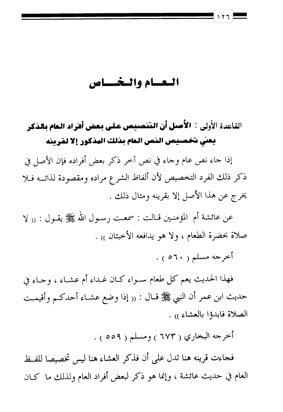 فجاءت قرينه هنا تدل على أن فذكر العشاء هنا ليس تخصيصاً للفظ العام في حديث عائشة، وإنما هو ذكر لبعض أفراد العام ولذلك ما كان