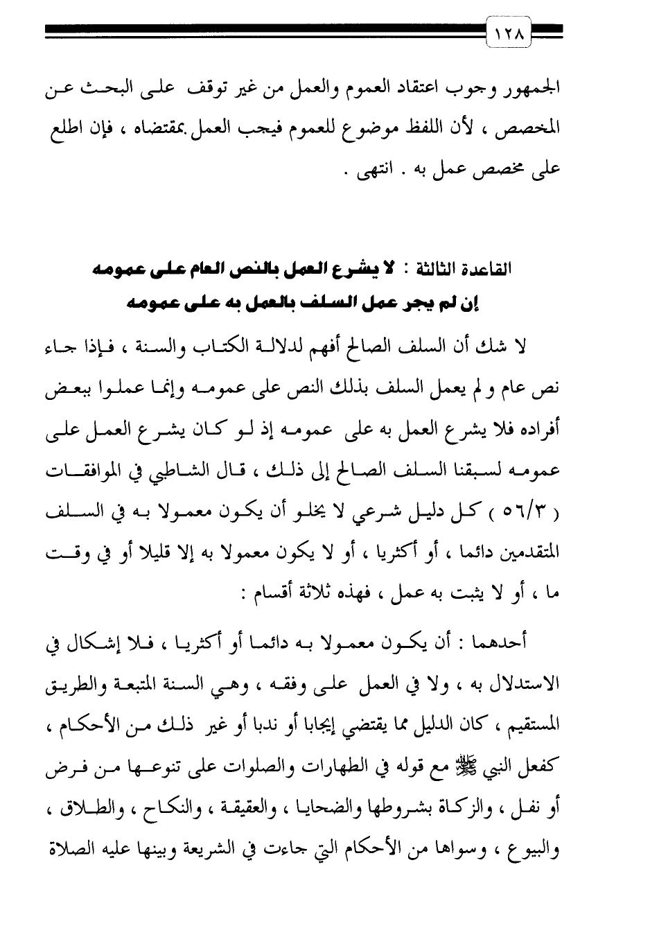 القاعدة الثالثة: لا يشرع العمل بالنص العام على عمومه إن لم يجر عمل السلف بالعمل به على عمومه