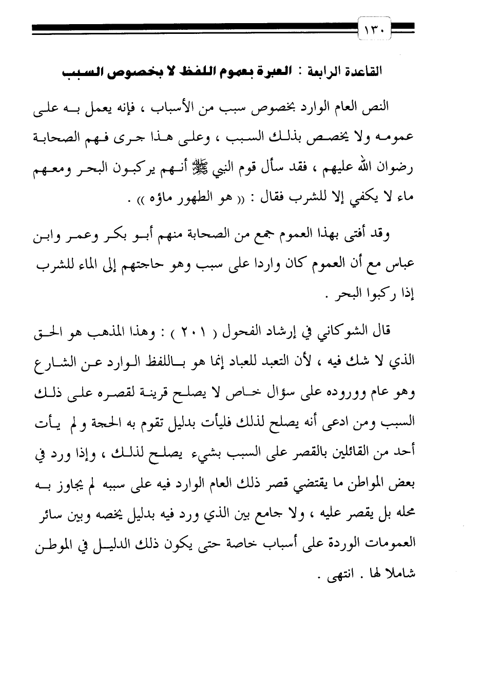 قال الشوكاني في إرشاد الفحول "201": وهذا المذهب هو الحق الذي لا شك فيه، لأن التعبد للعباد إنما هو باللفظ الوارد عن الشارع وهو عام ووروده على سؤال خاص لا يصلح قرينة لقصره على ذلك السبب ومن ادعى أنه يصلح لذلك فليأت بدليل تقوم به الحجة ولم يأت أحد من القائلين بالقصر على السبب بشيء يصلح لذلك، وإذا ورد في بعض المواطن ما يقتضي قصر ذلك العام الوارد فيه على سببه لم يجاوز به محله بل يقصر عليه، ولا جامع بين الذي ورد فيه بدليل يخصه وبين سائر العمومات الوردة على أسباب خاصة حتى يكون ذلك الدليل في الموطن شاملاً لها. انتهى.