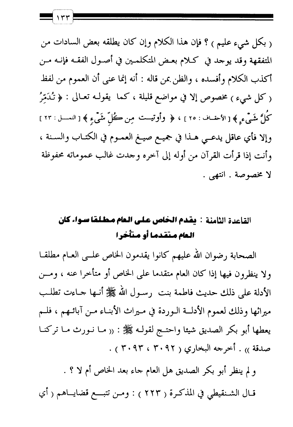 القاعدة الثامنة: يقدم الخاص على العام مطلقاً سواء كان العام متقدما أو متأخراً