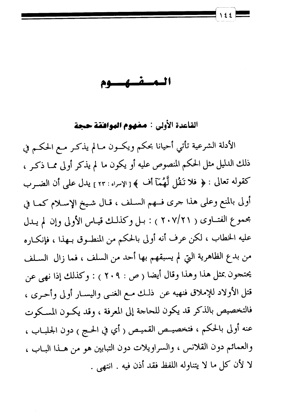 الأدلة الشرعية تأتي أحياناً بحكم ويكون مالم يذكر مع الحكم في ذلك الدليل مثل الحكم المنصوص عليه أو يكون ما لم يذكر أولى مما ذكر، كقوله تعالى: {فَلا تَقُلْ لَهُمَا أُفٍّ} [الإسراء: 23] يدل على أن الضرب أولى بالمنع وعلى هذا جرى فهم السلف، قال شيخ الإسلام كما في مجموع الفتاوى "21/207": بل وكذلك قياس الأولى وإن لم يدل عليه الخطاب، لكن عرف أنه أولى بالحكم من المنطوق بهذا، فإنكاره من بدع الظاهرية التي لم يسبقهم بها أحد من السلف، فما زال السلف يحتجون بمثل هذا وهذا وقال أيضا "ص: 209": وكذلك إذا نهى عن قتل الأولاد للإملاق فنهيه عن ذلك مع الغنى واليسار أولى وأحرى، فالتخصيص بالذكر قد يكون للحاجة إلى المعرفة، وقد يكون المسكوت عنه أولى بالحكم، فتخصيص القميص "أي في الحج" دون الجلباب، والعمائم دون القلانس، والسراويلات دون التبابين هو من هذا الباب، لا لأن كل ما لا يتناوله اللفظ فقد أذن فيه. انتهى.