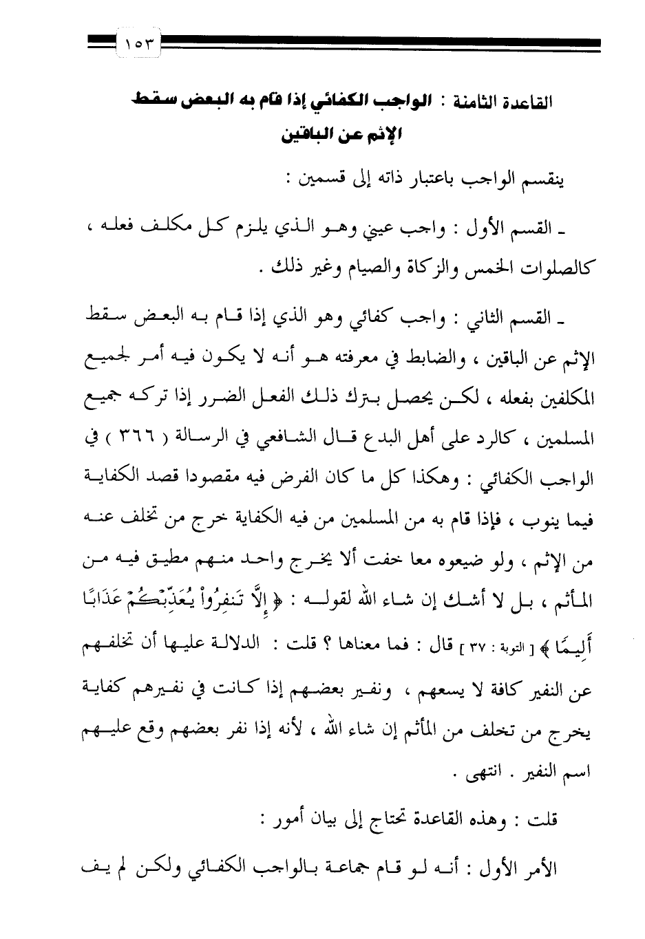 - القسم الثاني: واجب كفائي وهو الذي إذا قام به البعض سقط الإثم عن الباقين، والضابط في معرفته هو أنه لا يكون فيه أمر لجميع المكلفين بفعله، لكن يحصل بترك ذلك الفعل الضرر إذا تركه جميع المسلمين، كالرد على أهل البدع قال الشافعي في الرسالة "366" في الواجب الكفائي: وهكذا كل ما كان الفرض فيه مقصوداً قصد الكفاية فيما ينوب، فإذا قام به من المسلمين من فيه الكفاية خرج من تخلف عنه من الإثم، ولو ضيعوه معاً خفت ألا يخرج واحد منهم مطيق فيه من المأثم، بل لا أشك إن شاء الله لقوله: {إِلاّ تَنْفِرُوا يُعَذِّبْكُمْ عَذَاباً أَلِيماً} [التوبة: 37] قال: فما معناها؟ قلت: الدلالة عليها أن تخلفهم عن النفير كافة لا يسعهم، ونفير بعضهم إذا كانت في نفيرهم كفاية يُخْرِجُ مَنْ تَخَلَّفَ مِنَ المأثم إن شاء الله، لأنه إذا نفر بعضهم وقع عليهم اسم النفير. انتهى.