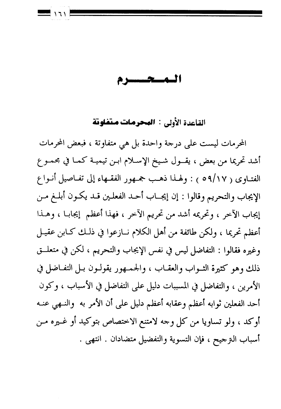 المحرمات ليست على درجة واحدة بل هي متفاوتة، فبعض المحرمات أشد تحريما من بعض، يقول شيخ الإسلام ابن تيمية كما في مجموع الفتاوى "17/59": ولهذا ذهب جمهور الفقهاء إلى تفاصيل أنواع الإيجاب والتحريم وقالوا: إن إيجاب أحد الفعلين قد يكون أبلغ من إيجاب الآخر، وتحريمه أشد من تحريم الآخر، فهذا أعظم إيجاباً، وهذا أعظم تحريماً، ولكن طائفة من أهل الكلام نازعوا في ذلك كابن عقيل وغيره فقالوا: التفاضل ليس في نفس الإيجاب والتحريم، لكن في متعلق ذلك وهو كثيرة الثواب والعقاب، والجمهور يقولون بل التفاضل في الأمرين، والتفاضل في المسببات دليل على التفاضل في الأسباب، وكون أحد الفعلين ثوابه أعظم وعقابه أعظم دليل على أن الأمر به والنهي عنه أوكد، ولو تساويا من كل وجه لامتنع الاختصاص بتوكيد أو غيره من أسباب الترجيح، فإن التسوية والتفضيل متضادان. انتهى.