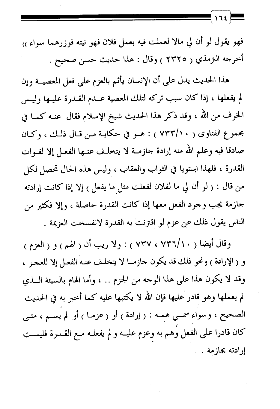 وقال أيضا "10/736، 737": ولا ريب أن "الهم" و "العزم" و "الإرادة" ونحو ذلك قد يكون جازما لا يتخلف عنه الفعل إلا للعجز، وقد لا يكون هذا على هذا الوجه من الجزم..، وأما الهام بالسيئة الذي لم يعملها وهو قادر عليها فإن الله لا يكتبها عليه كما أخبر به في الحديث الصحيح، وسواء سمي همه: "إرادة" أو "عزماً" أو لم يسم، متى كان قادراً على الفعل وهم به وعزم عليه ولم يفعله مع القدرة فليست إرادته بجازمة.