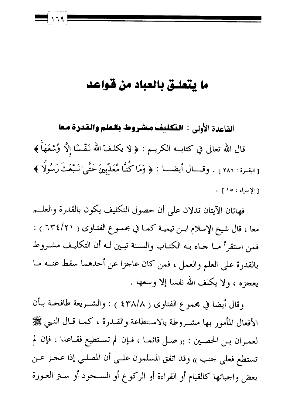 وقال أيضا في مجموع الفتاوى "8/438": والشريعة طافحة بأن الأفعال المأمور بها مشروطة بالاستطاعة والقدرة، كما قال النبي صلى الله عليه وسلم لعمران بن الحصين: "صَل قائما، فإن لم تستطيع فقاعداً، فإن لم تستطع فعلى جنب" وقد اتفق المسلمون على أن المصلي إذا عجز عن بعض واجباتها كالقيام أو القراءة أو الركوع أو السجود أو ستر العورة