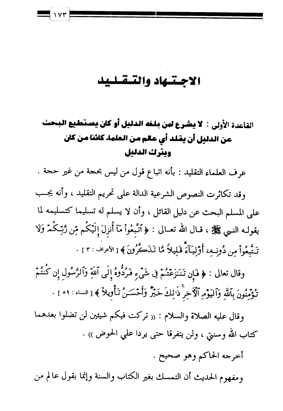 القاعدة الأولى: لا يشرع لمن بلغه الدليل أو كان يستطيع البحث عن الدليل أن يقلد أي عالم من العلماء كائنا من كان ويترك الدليل