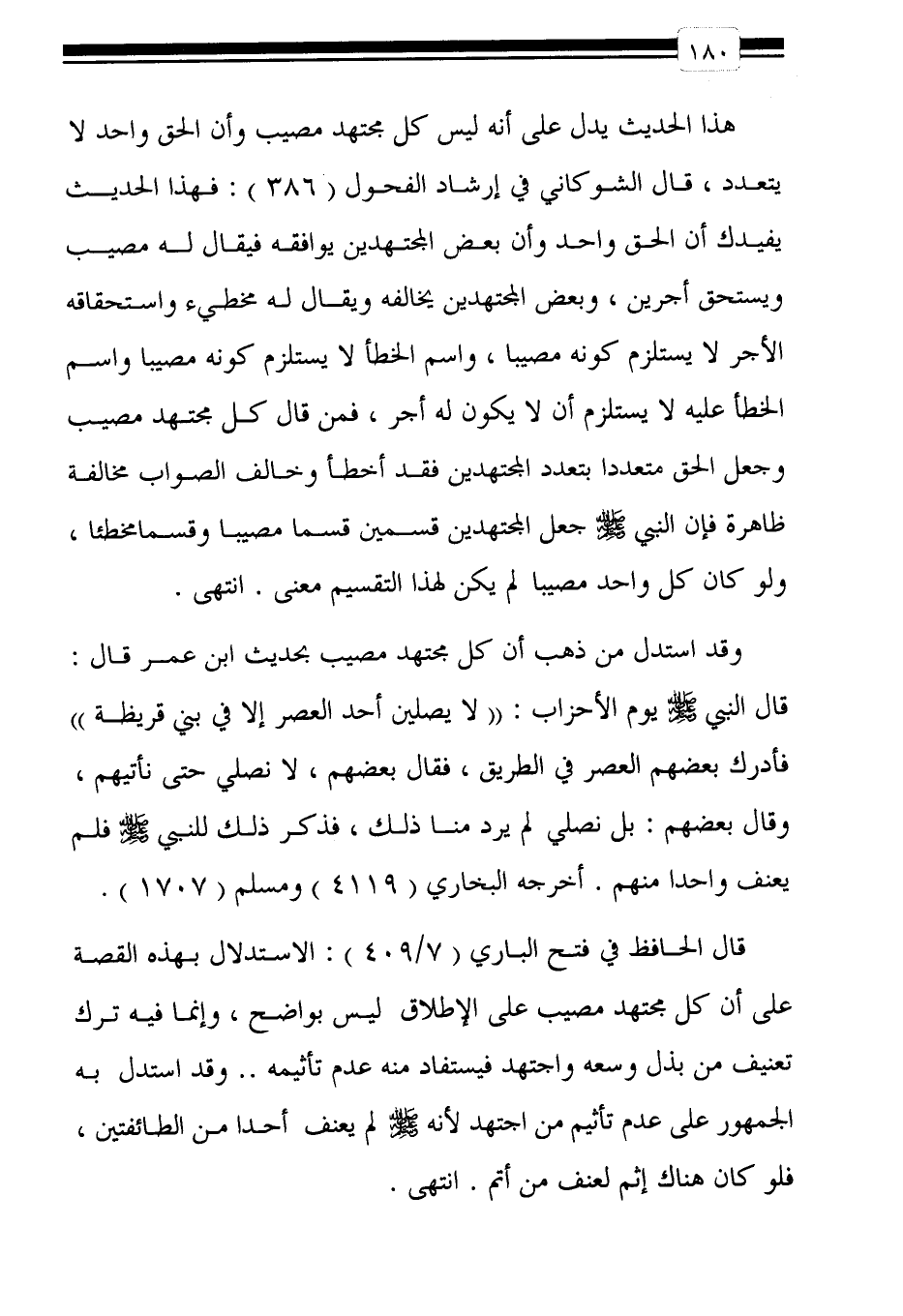 وقد استدل من ذهب أن كل مجتهد مصيب بحديث ابن عمر قال: قال النبي صلى الله عليه وسلم يوم الأحزاب: "لا يصلين أحد العصر إلا في بني قريظة" فأدرك بعضهم العصر في الطريق، فقال بعضهم، لا نصلي حتى نأتيهم، وقال بعضهم: بل نصلي لم يرد منا ذلك، فذكر ذلك النبي صلى الله عليه وسلم فلم يعنف واحداً منهم. أخرجه البخاري "4119" ومسلم "1707".