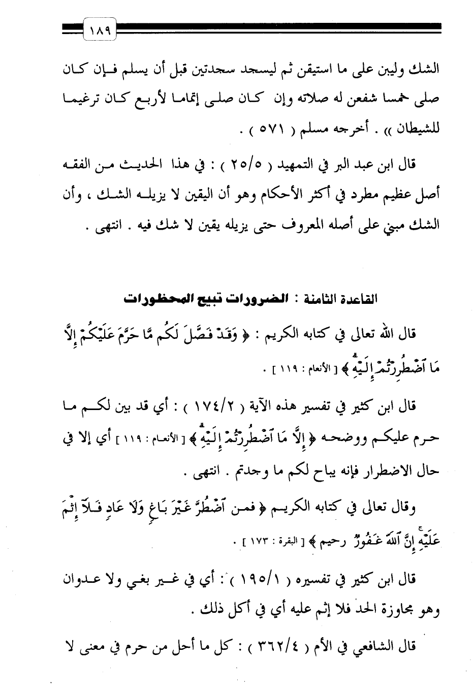 وقال تعالى في كتابه الكريم: {فَمَنِ اضْطُرَّ غَيْرَ بَاغٍ وَلا عَادٍ فَلا إِثْمَ عَلَيْهِ إِنَّ اللَّهَ غَفُورٌ رَحِيمٌ} البقرة: 173] .