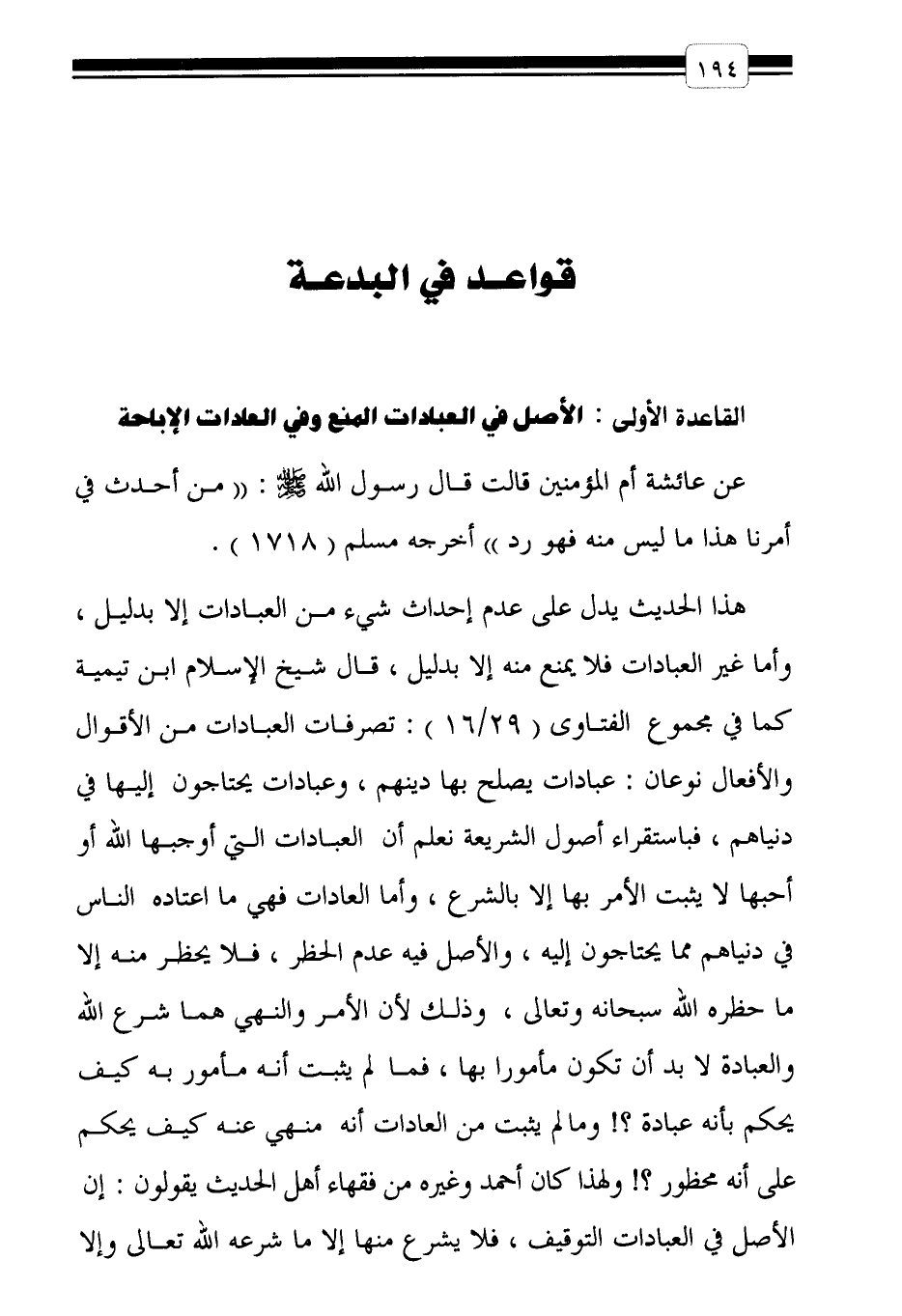 القاعدة الأولى: الأصل في العبادات المنع وفي العادات الإباحة