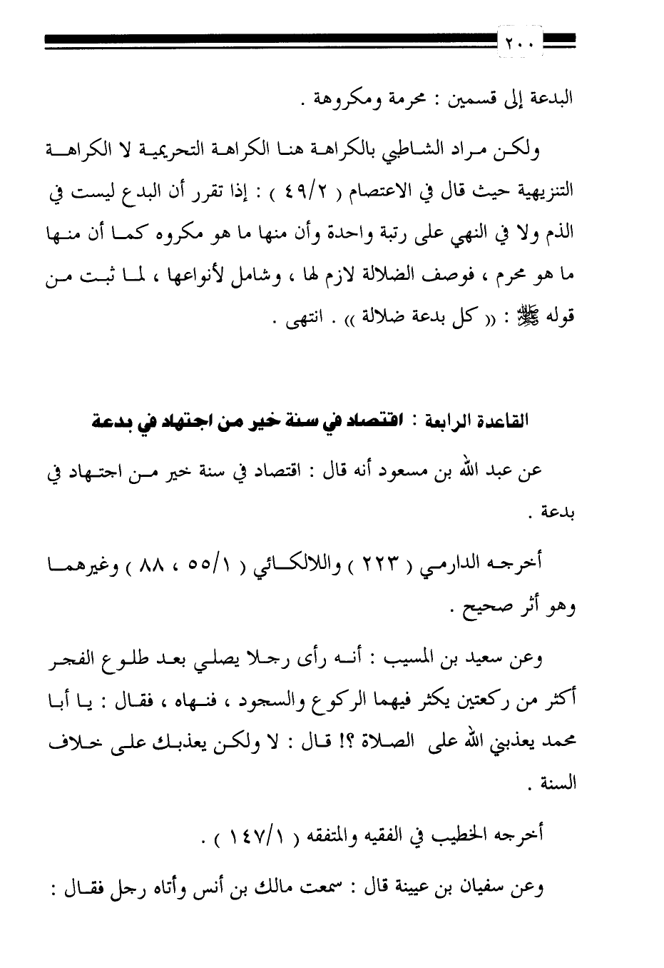 ولكن مراد الشاطبي بالكراهة هنا الكراهة التحريمية لا الكراهة التنزيهية حيث قال في الاعتصام "2/49": إذا تقرر أن البدع ليست في الذم ولا في النهي على رتبة واحدة وأن منها ما هو مكروه كما أن منها ما هو محرم، فوصف الضلالة لازم لها، وشامل لأنواعها، لما ثبت من قوله صلى الله عليه وسلم: "كل بدعة ضلالة". انتهى.