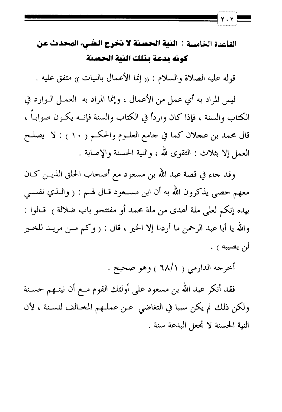 القاعدة الخامسة: النية الحسنة لا تخرج الشيء المحدث عن كونه بدعة بتلك النية الحسنة