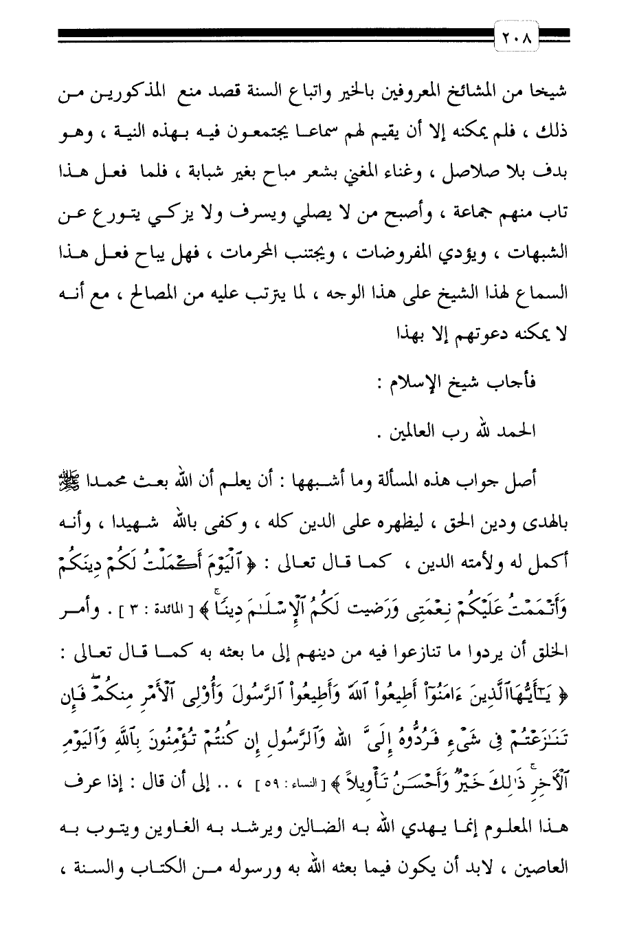 أصل جواب هذه المسألة وما أشبهها: أن يعلم أن الله بعث محمداً صلى الله عليه وسلم بالهدى ودين الحق، ليظهره على الدين كله، وكفى باله شهيدا، وأنه أكمل له ولأمته الدين، كما قال تعالى: {الْيَوْمَ أَكْمَلْتُ لَكُمْ دِينَكُمْ وَأَتْمَمْتُ عَلَيْكُمْ نِعْمَتِي} [المائدة: 3] . وأمر الخلق أن يردوا ما تنازعوا فيه من دينهم إلى ما بعثه به كما قال تعالى: {يَا أَيُّهَا الَّذِينَ آمَنُوا أَطِيعُوا اللَّهَ وَأَطِيعُوا الرَّسُولَ وَأُولِي الْأَمْرِ مِنْكُمْ فَإِنْ تَنَازَعْتُمْ فِي شَيْءٍ فَرُدُّوهُ إِلَى اللَّهِ وَالرَّسُولِ إِنْ كُنْتُمْ تُؤْمِنُونَ بِاللَّهِ وَالْيَوْمِ الْآخِرِ ذَلِكَ خَيْرٌ وَأَحْسَنُ تَأْوِيلاً} [النساء: 59] ،.. إلى أن قال: إذا عرف هذا المعلوم إنما يهدي الله به الضالين ويرشد به الغاوين ويتوب به العاصين، لابد أن يكون فيما بعثه الله به ورسوله من الكتاب والسنة،
