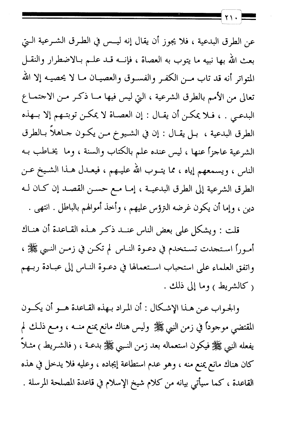 قلت: ويشكل على بعض الناس عند ذكر هذه القاعدة أن هناك أمور استجدت تستخدم في دعوة الناس لم تكن في زمن النبي صلى الله عليه وسلم، واتفق العلماء على استحباب استعمالها في دعوة الناس إلى عبادة ربهم "كالشريط" وما إلى ذلك.