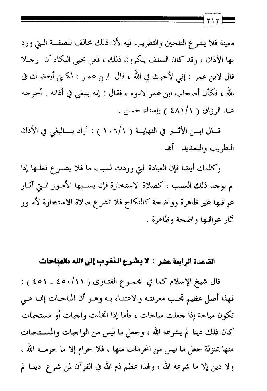 القاعدة الرابعة عشر: لا يشرع التقرب إلى الله بالمباحات