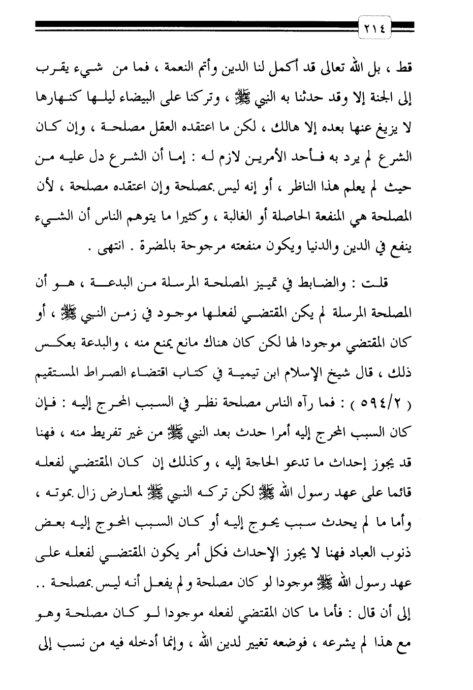 قط، بل الله تعالى قد أكمل لنا الدين وأتم النعمة، فما من شيء يقرب إلى الجنة إلا وقد حدثنا به النبي صلى الله عليه وسلم، وتركنا على البيضاء ليلها كنهارها لا يزيغ عنها بعده إلا هالك، لكن ما اعتقده العقل مصلحة، وإن كان الشرع لم يرد به فأحد الأمرين لازم له: إما أن الشرع دل عليه من حيث لم يعلم هذا الناظر، أو إنه ليس بمصلحة وإن اعتقده مصلحة، لأن المصلحة هي المنفعة الحاصلة أو الغالبة، وكثيراً ما يتوهم الناس أن الشيء ينفع في الدين والدنيا ويكون منفعته مرجوحة بالمضرة. انتهى.
