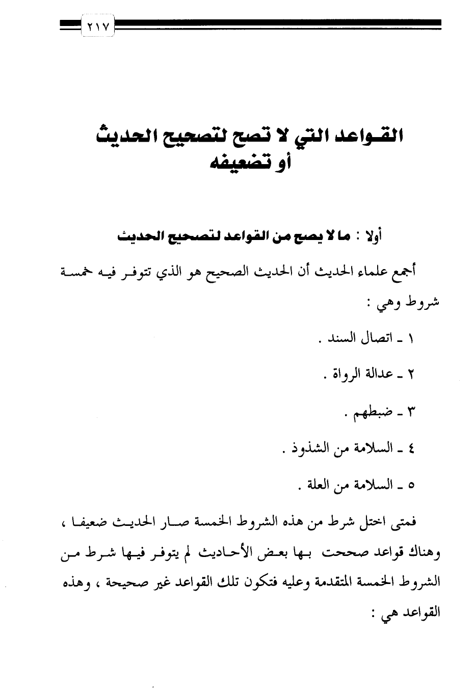 فمتى اختلَّ شرط من هذه الشروط الخمسة صار الحديث ضعيفاً، وهناك قواعد صححت بها بعض الأحاديث لم تتوفر فيها شرط من الشروط الخمسة المتقدمة وعليه فتكون تلك القواعد غير صحيحة، وهذه القواعد هي: