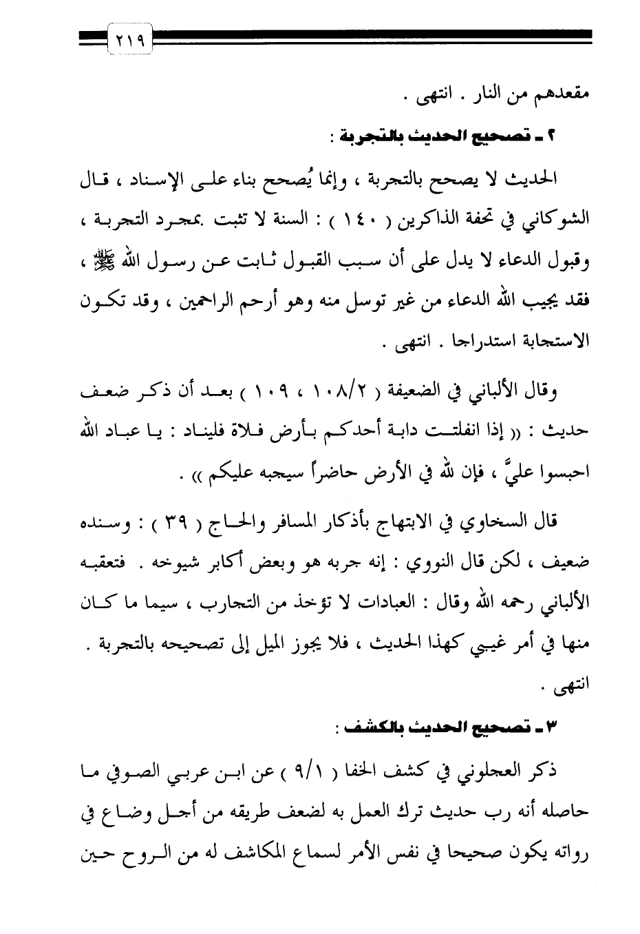 قال السخاوي في الإبتهاج بأذكار المسافر والحاج "39": وسنده ضعيف، لكن قال النووي: إنه جربه وهو وبعض أكابر شيوخه. فتعقبه الألباني رحمه الله وقال: العبادات لا تؤخذ من التجارب، سيما ما كان منها في أمر غيبي كهذا الحديث، فلا يجوز الميل إلى تصحيحه بالتجربة. انتهى.