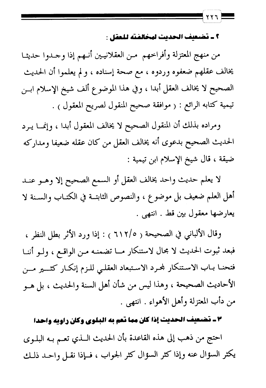 من منهج المعتزلة وأفراخهم من العقلانيين وأنهم إذا وجدوا حديثاً يخالف عقلهم ضعفوه وردوه، مع صحة إسناده، ولم يعلموا أن الحديث الصحيح لا يخالف العقل أبداً، وفي هذا الموضوع ألَّف شيخ الإسلام ابن تيمية كتابه الرائع: "موافقه صحيح المنقول لصريح المعقول".