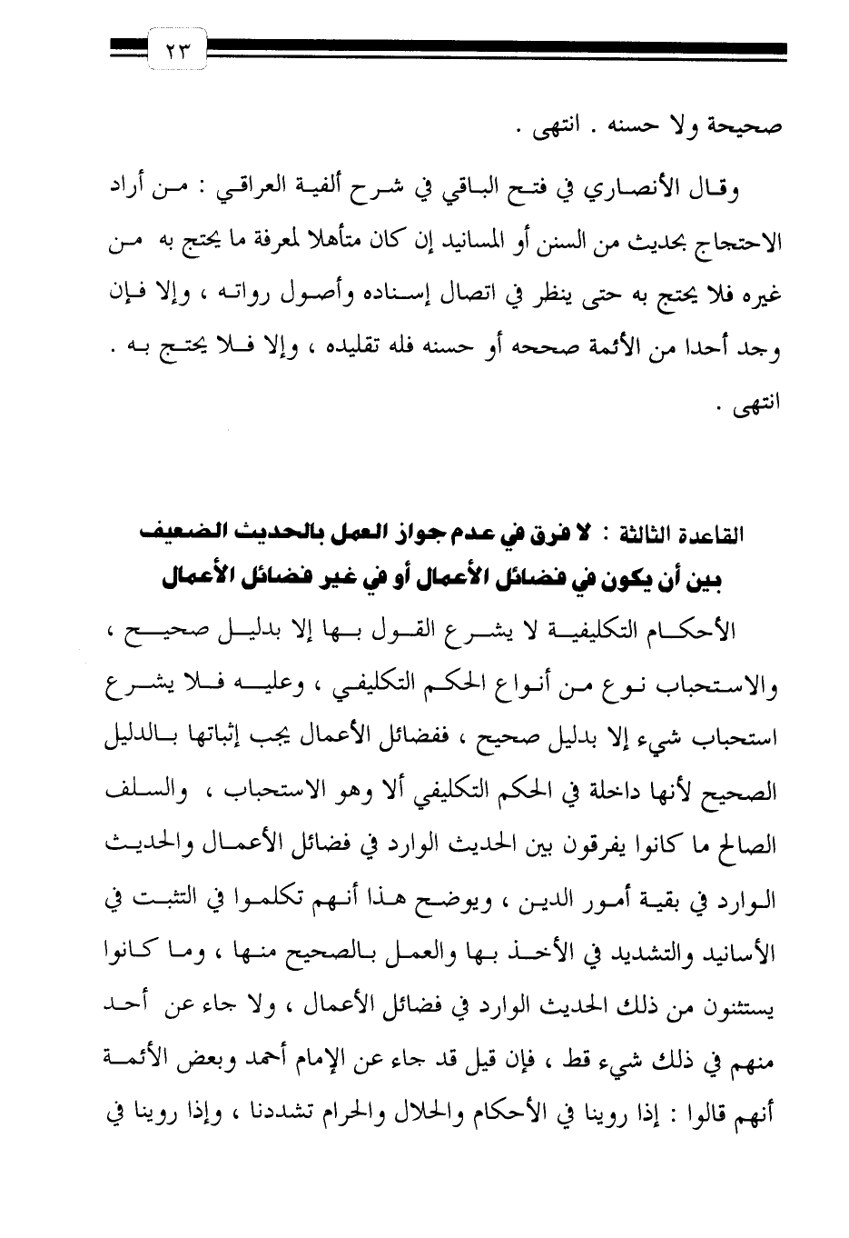 القاعدة الثالثة: لا فرق في عدم جواز العمل بالحديث الضعيف بين أن يكون في فضائل الأعمال أو في غير فضائل الأعمال