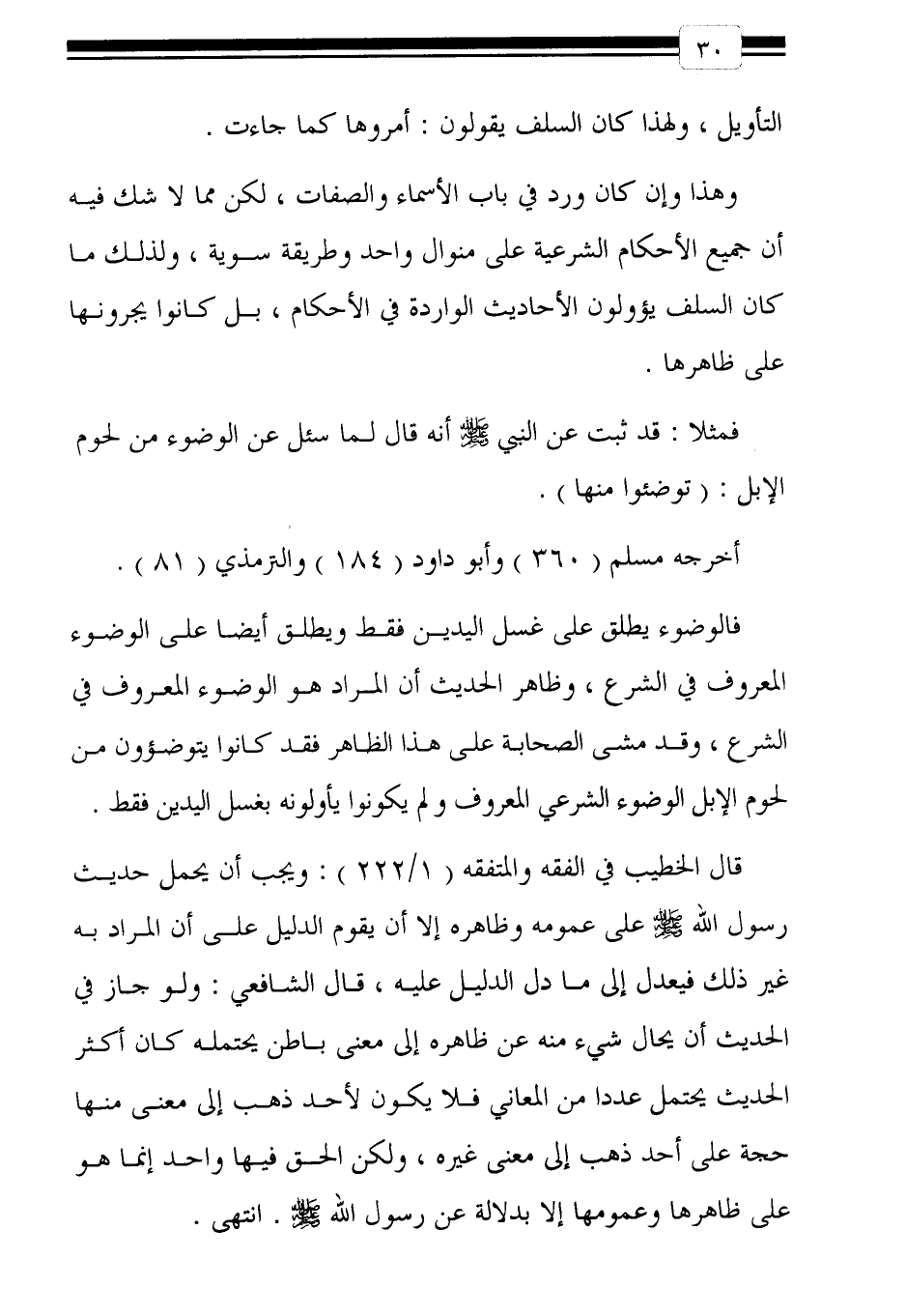 وهذا وإن كان ورد في باب الأسماء والصفات، لكن مما لا شك فيه أن جميع الأحكام الشرعية على منوال واحد وطريقة سوية، ولذلك ما كان السلف يؤولون الأحاديث الواردة في الأحكام، بل كانوا يجرونها على ظاهرها.