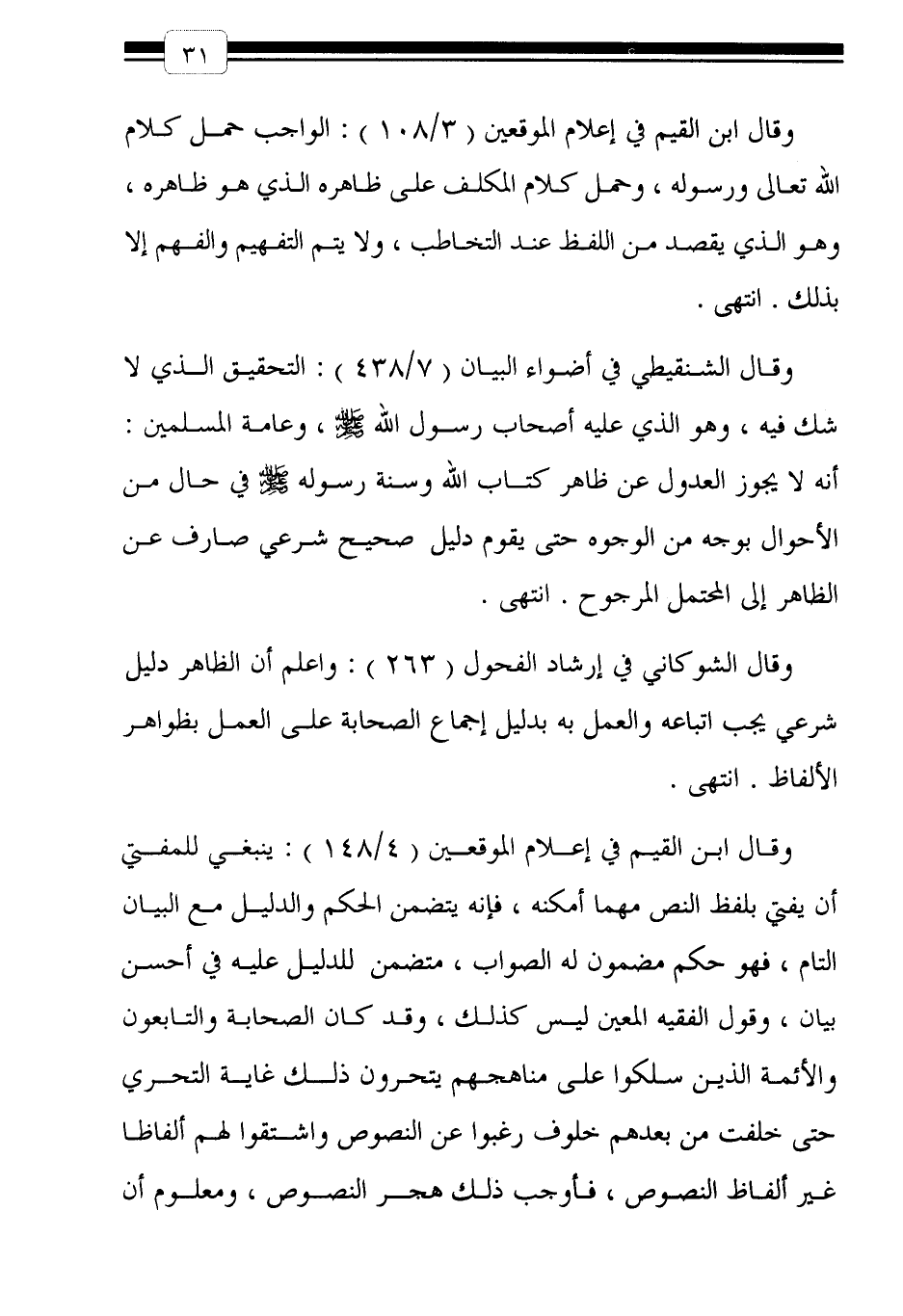 وقال ابن القيم في إعلام الموقعين "4/148": ينبغي للمفتي أن يفتي بلفظ النص مهما أمكنه، فإنه يتضمن الحكم والدليل مع البيان التام، فهو حكم مضمون له الصواب، متضمن للدليل عليه في أحسن بيان، وقول الفقيه المعين ليس كذلك، وقد كان الصحابة والتابعون والأئمة الذين سلكوا على مناهجهم يتحرون ذلك غاية التحري حتى خلفت من بعدهم خلوف رغبوا عن النصوص واشتقوا لهم ألفاظاً غير ألفاظ النصوص، فأوجب ذلك هجر النصوص، ومعلوم أن