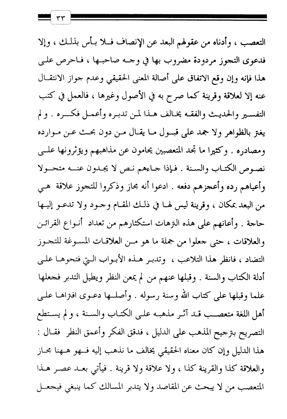 التعصب، وأدناه من عقولهم البُعد عن الإنصاف فلا بأس بذلك، وإلاّ فدعوى التجوز مردودة مضروب بها في وجه صاحبها، فاحرص على هذا فإنه وإن وقع الاتفاق على أصالة المعنى الحقيقي وعدم جواز الانتقال عنه إلا لعلاقة وقرينة كما صُرح به في الأصول وغيرها، فالعمل في كتب التفسير والحديث والفقه يخالف هذا لمن تدبره وأعمل فكره. ولم يغتر بالظواهر ولا جمد على قبول ما يُقال من دون بحث عن موارده ومصادره. وكثيراً ما تجد المتعصبين يحامون عن مذاهبهم ويؤثرونها على نصوص الكتاب والسنة. فإذا جاءهم نص لا يجدون عنه متحولاً وأعياهم رده وأعجزهم دفعه. ادعوا أنه مجاز وذكروا للتجوز علاقة هي من البعد بمكان، وقرينة ليس لها في ذلك المقام وجود ولا تدعو إليها حاجة. وأعانهم على هذه الترهات استكثارهم من تعداد أنواع القرائن والعلاقات، حتى جعلوا من جملة ما هو من العلاقات المسوّغة للتجوز التضاد، فانظر هذا التلاعب، وتدبر هذه الأبواب التي فتحوها على أدلة الكتاب والسنة. وقَبِلَها عنهم من لم يمعن النظر ويطيل التدبر فجعلها علماً وقبلها على كتاب الله وسنة رسوله. وأصلها دعوى افتراها على أهل اللغة متعصب قد آثر مذهبه على الكتاب والسنة، ولم يستطع التصريح بترجيح المذهب على الدليل، فدقّقَ الفكر وأعمق النظر فقال: هذا الدليل وإن كان معناه الحقيقي يخالف ما نذهب إليه فهو ههنا مجاز والعلاقة كذا والقرينة كذا، ولا علاقة ولا قرينة. فيأتي بعد عصر هذا المتعصب من لا يبحث عن المقاصد ولا يتدبر المسالك كما ينبغي فيجعل