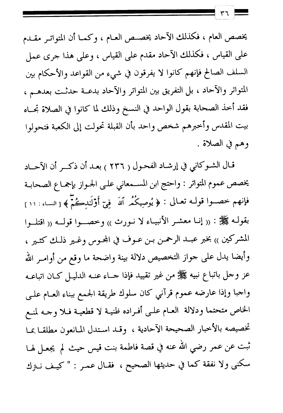 يخصص العام، فكذلك الآحاد يخصص العام، وكما أن المتواتر مقدم على القياس، فكذلك الآحاد مقدم على القياس، وعلى هذا جرى عمل السلف الصالح فإنهم كانوا لا يفرقون في شيء من القواعد والأحكام بين المتواتر والآحاد، بل التفريق بين المتواتر والآحاد بدعة حدثت بعدهم، فقد أخذ الصحابة بقول الواحد في النسخ وذلك لما كانوا في الصلاة تجاه بيت المقدس وأخبرهم شخص واحد بأن القبلة تحولت إلى الكعبة فتحولوا وهم في الصلاة.