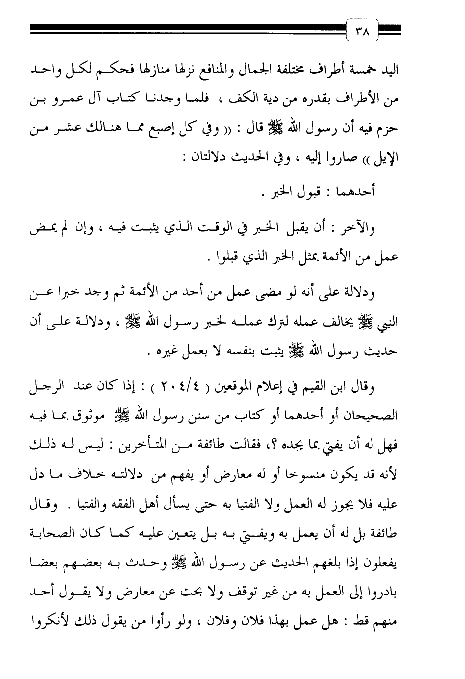وقال ابن القيم في إعلام الموقعين "4/204": إذا كان عند الرجل الصحيحان أو أحدهما أو كتاب من سنن رسول الله صلى الله عليه وسلم موثوق بما فيه فهل له أن يفتي بما يجده؟ ، فقالت طائفة من المتأخرين: ليس له ذلك لأنه قد يكون منسوخاً أو له معارض أو يفهم من دلالته خلاف ما دل عليه فلا يجوز له العمل ولا الفتيا به حتى يسأل أهل الفقه والفتيا. وقال طائفة بل له أن يعمل به ويفتي به بل يتعين عليه كما كان الصحابة يفعلون إذا بلغهم الحديث عن رسول الله صلى الله عليه وسلم وحدث به بعضهم بعضاً بادروا إلى العمل به من غير توقف ولا بحث عن معارض ولا يقول أحد منهم قط: هل عمل بهذا فلان وفلان، ولو رأوا من يقول ذلك لأنكروا عليه