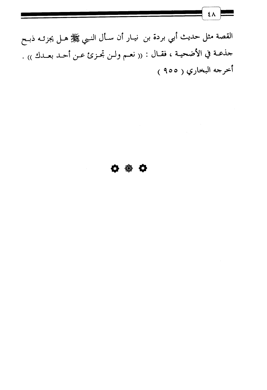 القصة مثل حديث أبي بردة بن نيار أن سأل النبي صلى الله عليه وسلم هل يجزئه ذبح جذعة في الأضحية، فقال: "نعم ولن تجزئ عن أحد بعدك". أخرجه البخاري "955"
