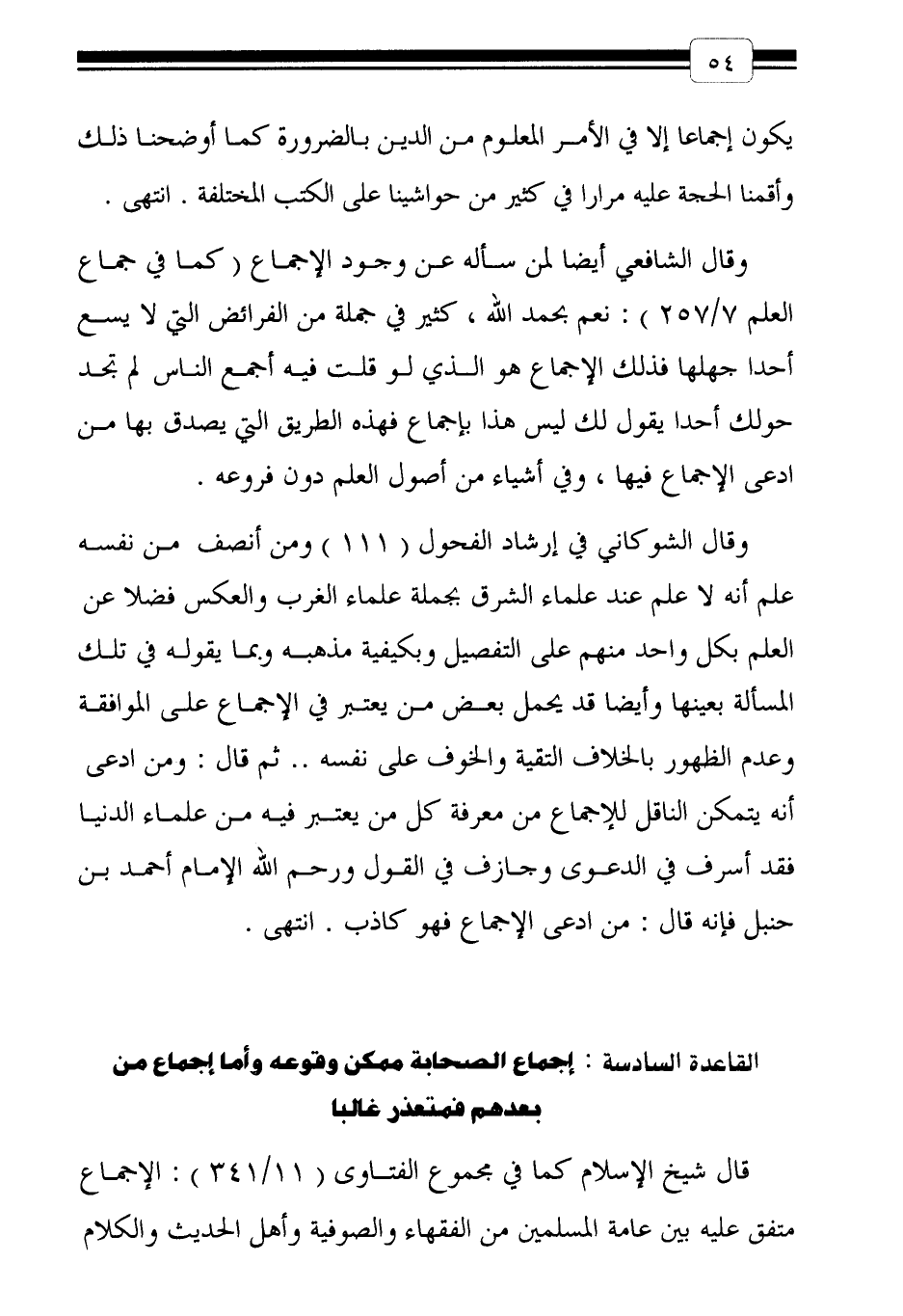 القاعدة السادسة: إجماع الصحابة ممكن وقوعه وأما إجماع من بعدهم فمتعذر غالباً