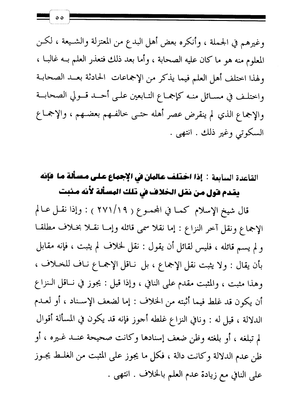 القاعدة السابعة: إذا اختلف عالمان في الإجماع على مسألة ما فإنه يقدم قول من نقل الخلاف في تلك المسألة لأنه مثبت