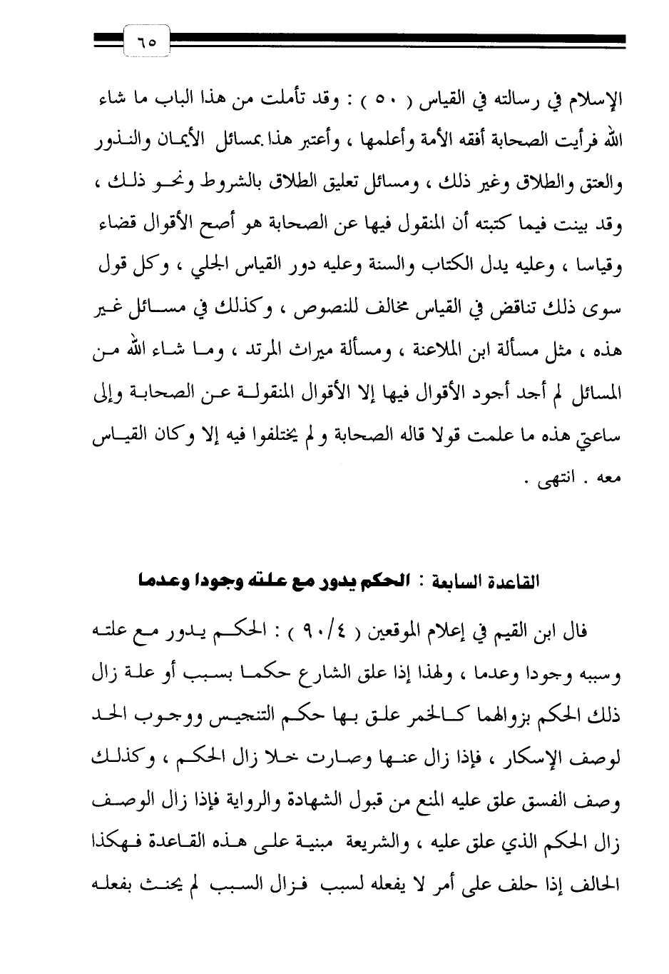 الإسلام في رسالته في القياس "50": وقد تأملت من هذا الباب ما شاء الله فرأيت الصحابة أفقه الأمة وأعلمها، وأعتبر هذا بمسائل الأيمان والنذور والعتق والطلاق وغير ذلك، ومسائل تعليق الطلاق بالشروط ونحو ذلك، وقد بينت فيما كتبته أن المنقول فيها عن الصحابة هو أصح الأقوال قضاء وقياساً، وعليه يدل الكتاب والسنة وعليه دور القياس الجلي، وكل قول سوى ذلك تناقض في القياس مخالف للنصوص، وكذلك في مسائل غير هذه، مثل مسألة ابن الملاعنة، ومسألة ميراث المرتد، وما شاء الله من المسائل لم أجد أجود الأقوال فيها إلا الأقوال المنقولة عن الصحابة وإلى ساعتي هذه ما علمت قولاً قاله الصحابة ولم يختلفوا فيه إلا وكان القياس معه. انتهى.