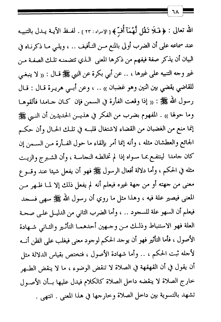 الله تعالى: {فَلا تَقُل لَهُمَا أُفٍّ} [الإسراء: 23] . لفظ الآية يدل بالتنبيه عند سماعه على أن الضرب أولى بالمنع من التأفيف..، ويلي ما ذكرناه في البيان أن يذكر صفة فيفهم من ذكرها المعنى الذي تتضمنه تلك الصفة من غير وجه التنبيه على غيرها،.. عن أبي بكرة عن النبي صلى الله عليه وسلم قال: "لا ينبغي للقاضي يقضي بين اثنين وهو غضبان"..، وعن أبي هريرة قال: قال رسول الله صلى الله عليه وسلم: "إذا وقعت الفأرة في السمن فإن كان جامداً فألقوها وما حولها". المفهوم بضرب من الفكر في هذين الحديثين أن النبي صلى الله عليه وسلم إنما منع من الغضبان من القضاء لاشتغال قلبه في تلك الحال وأن حكم الجائع والعطشان مثله، وأنه إنما أمر بإلقاء ما حول الفأرة من السمن إن كان جامداً لينتفع بما سواه إذا لم تخالطه النجاسة، وأن الشبرج والزيت مثله في الحكم، وأما دلالة أفعال الرسول صلى الله عليه وسلم فهو أن يفعل شيئا عند وقوع معنى من جهته أو من جهة غيره فيعلم أنه لم يفعل ذلك إلا لما ظهر من المعنى فيصير علة فيه، وهذا مثل ما روي أن رسول الله صلى الله عليه وسلم سهى فسجد فيعلم أن السهو علة للسجود..، وأما الضرب الثاني من الدليل على صحة العلة فهو الاستنباط وذلك من وجهين أحدهما التأثير والثاني شهادة الأصول، فأما التأثير فهو أن يوجد الحكم لوجود معنى فيغلب على الظن أنه لأجله ثبت الحكم،.. وأما شهادة الأصول، فتختص بقياس الدلالة مثل أن يقول في أن القهقهة في الصلاة لا تنقض الوضوء، ما لا ينقض الطهر خارج الصلاة لا ينقضه داخل الصلاة كالكلام فيدل عليها بأن الأصول تشهد بالتسوية بين داخل الصلاة وخارجها في هذا المعنى. انتهى.